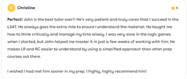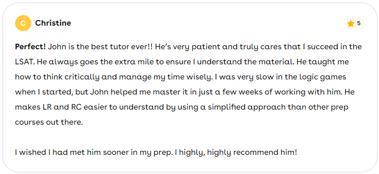 ”John is the best tutor ever!! He’s very patient and truly cares that I succeed in the LSAT. He always goes the extra mile to ensure I understand the material. He taught me how to think critically and manage my time wisely. I was very slow in the logic games when I started, but John helped me master it in just a few weeks of working with him. He makes LR and RC easier to understand by using a simplified approach than other prep courses out there.