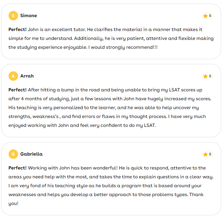 ”John is AMAZING! I was having a lot of difficult with Assumption and Strengthen/Weaken questions. John simplified them and taught me how to break down questions and make them easier to understand.”